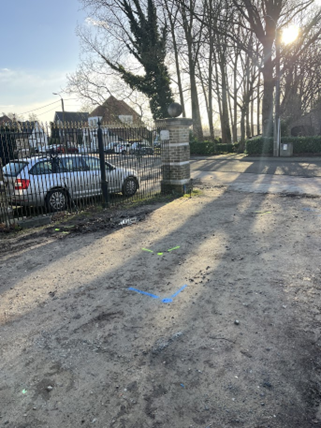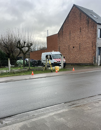 On January 7 and 8, 2025, I spent two days shadowing a surveyor at the surveying office Daenick-Audenart & Tallieu. On January 7, I primarily performed fieldwork. During the first two tasks, we had to mark out an electrical cabinet using wooden stakes. For the first task, we were able to put all the stakes into the ground. For the second task, the cabinet was located on a construction site that was still under development, and the cabinet would be situated at the temporary entrance and exit of the site. Therefore, we put only two stakes into the ground and marked the rest with spray paint.